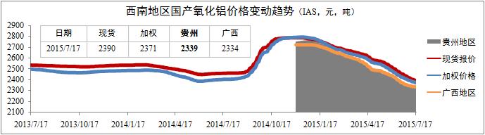 國產(chǎn)氧化鋁價(jià)格降幅收窄。監控數據顯示,現階段國產(chǎn)氧化鋁價(jià)格仍然維持下滑趨勢,但整體降幅有所收窄。截至7月17日,國產(chǎn)現貨報價(jià)2390元/噸,月化日均降幅為0.11%,較6月份收窄0.06個(gè)百分點(diǎn);貴州地區報價(jià)2339元/噸,月化日均降幅為0.06%,較6月份收窄0.11個(gè)百分點(diǎn);廣西地區報價(jià)略低于貴州地區,月化日均降幅與貴州地區保持基本一致。
