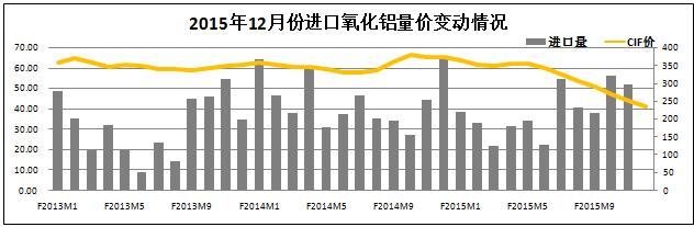 進(jìn)口市場(chǎng)情況。統計期內,進(jìn)口氧化鋁市場(chǎng)價(jià)格波動(dòng)趨勢基與國內市場(chǎng)基本一致。進(jìn)口量方面,11月全國進(jìn)口氧化鋁52萬(wàn)噸,較去年同期增長(cháng)18%,環(huán)比有所回落;價(jià)格方面,11CIF均價(jià)236美元,折合人民幣1529/,環(huán)比下降5.6%。進(jìn)口價(jià)格持續下跌折射出國際有色市場(chǎng)的悲觀(guān)氣氛仍在持續,同時(shí)進(jìn)口價(jià)格下跌速度放緩將會(huì )轉化進(jìn)口需求為國產(chǎn)需求。