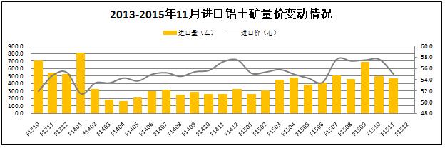海關(guān)數據顯示,11月我國進(jìn)口鋁土礦460萬(wàn)噸,環(huán)比下降了6.12%,降幅較上期收窄了21.8個(gè)百分點(diǎn)。價(jià)格方面,報告期內進(jìn)口均價(jià)較上月普遍下降2-3美元的幅度,11月進(jìn)口均價(jià)為55美元。從數據分布上看,影響11月進(jìn)口鋁土礦量下滑的主要原因是大部分氧化鋁企業(yè)虧損,部分廠(chǎng)家開(kāi)始減產(chǎn),同時(shí)進(jìn)口礦石價(jià)格下跌的觀(guān)望氣氛逐步增強。
