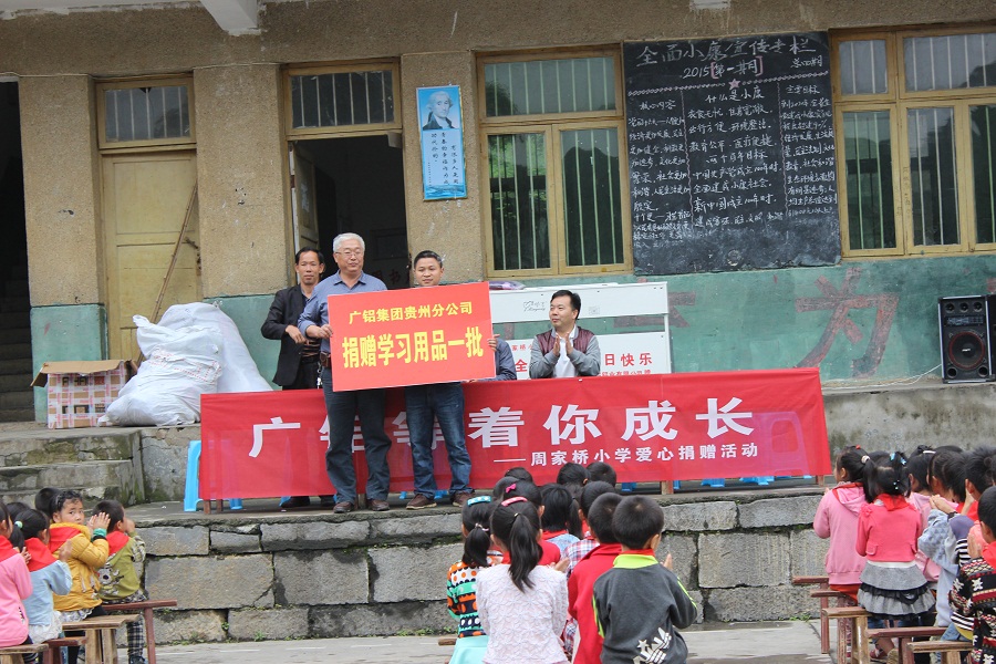 2015年5月27日,在六•一國際兒童節來(lái)臨之際,為豐富孩子們的精神生活,讓留守兒童度過(guò)一個(gè)多姿多彩的節日,在清鎮市工會(huì )領(lǐng)導的帶領(lǐng)下,貴州廣鋁鋁業(yè)有限公司工會(huì )組織公司人資處、財務(wù)處、安環(huán)處等相關(guān)處室人員前往犁倭鎮周家橋小學(xué)開(kāi)展愛(ài)心捐贈活動(dòng)。