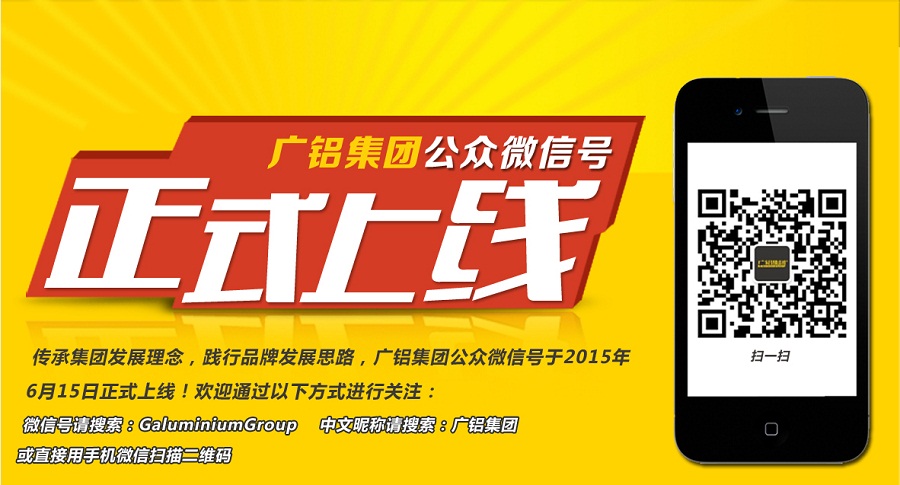 廣鋁集團公眾微信號已認證開(kāi)通并上線(xiàn)運行,歡迎廣大朋友及客戶(hù)關(guān)注廣鋁集團微信公眾號。我們有理由期待,廣鋁集團公眾微信號將會(huì )帶給廣大朋友及客戶(hù)更加值得期待的服務(wù)。