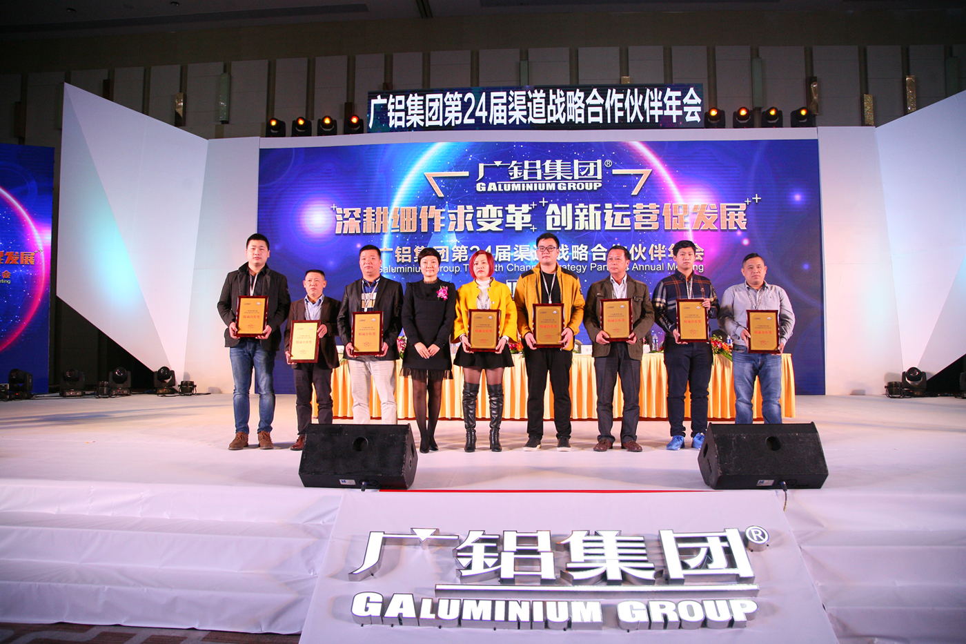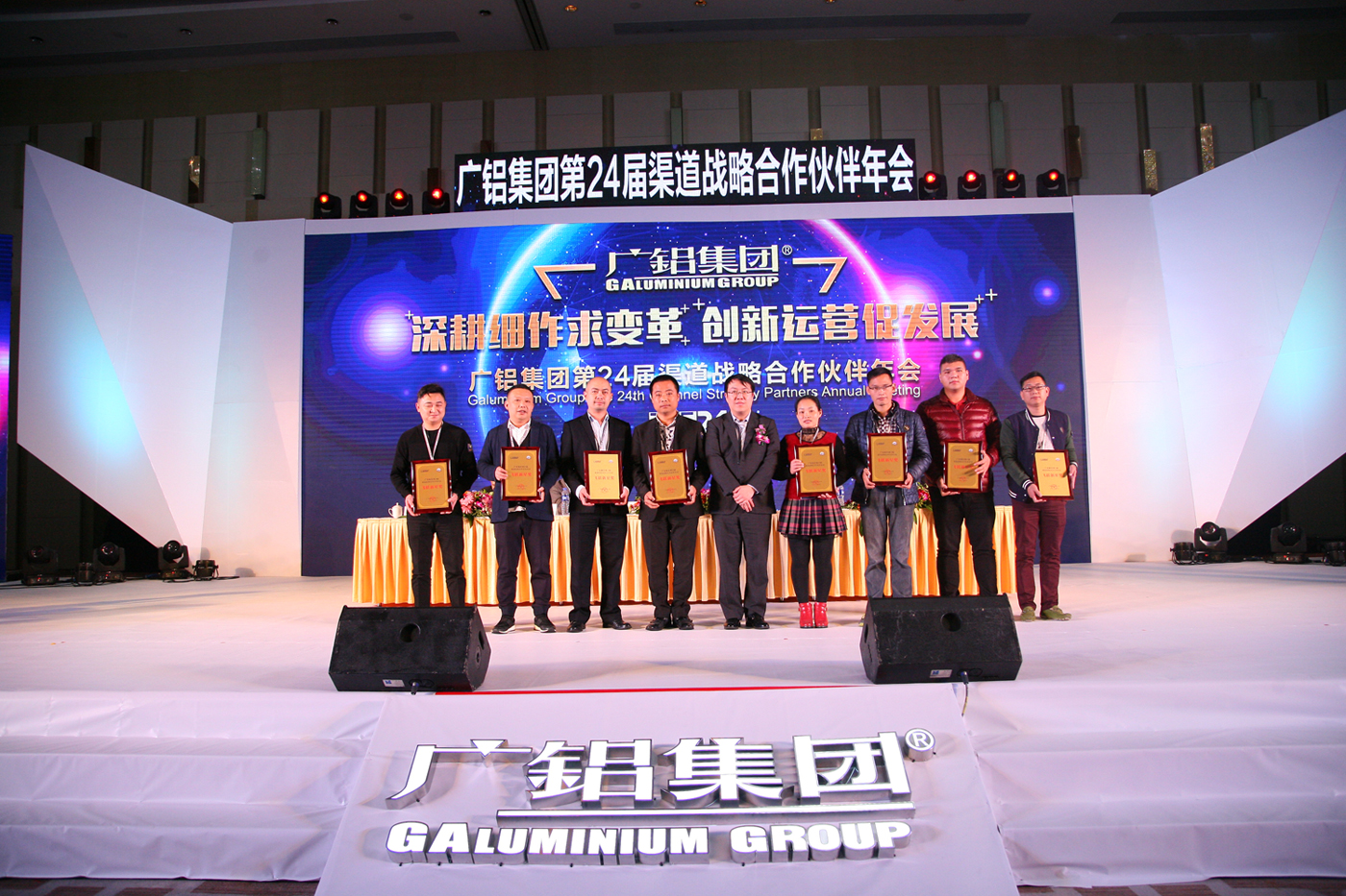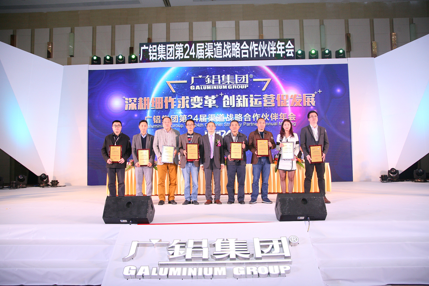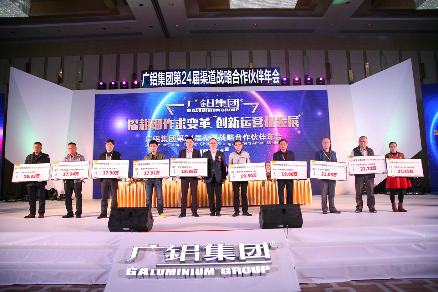 為感謝廣大合作伙伴一直以來(lái)對廣鋁的信賴(lài)與支持,會(huì )上,葉鵬智董事長(cháng)和廣東廣鋁鋁業(yè)公司領(lǐng)導,為2016年表現卓越的合作伙伴頒獎。