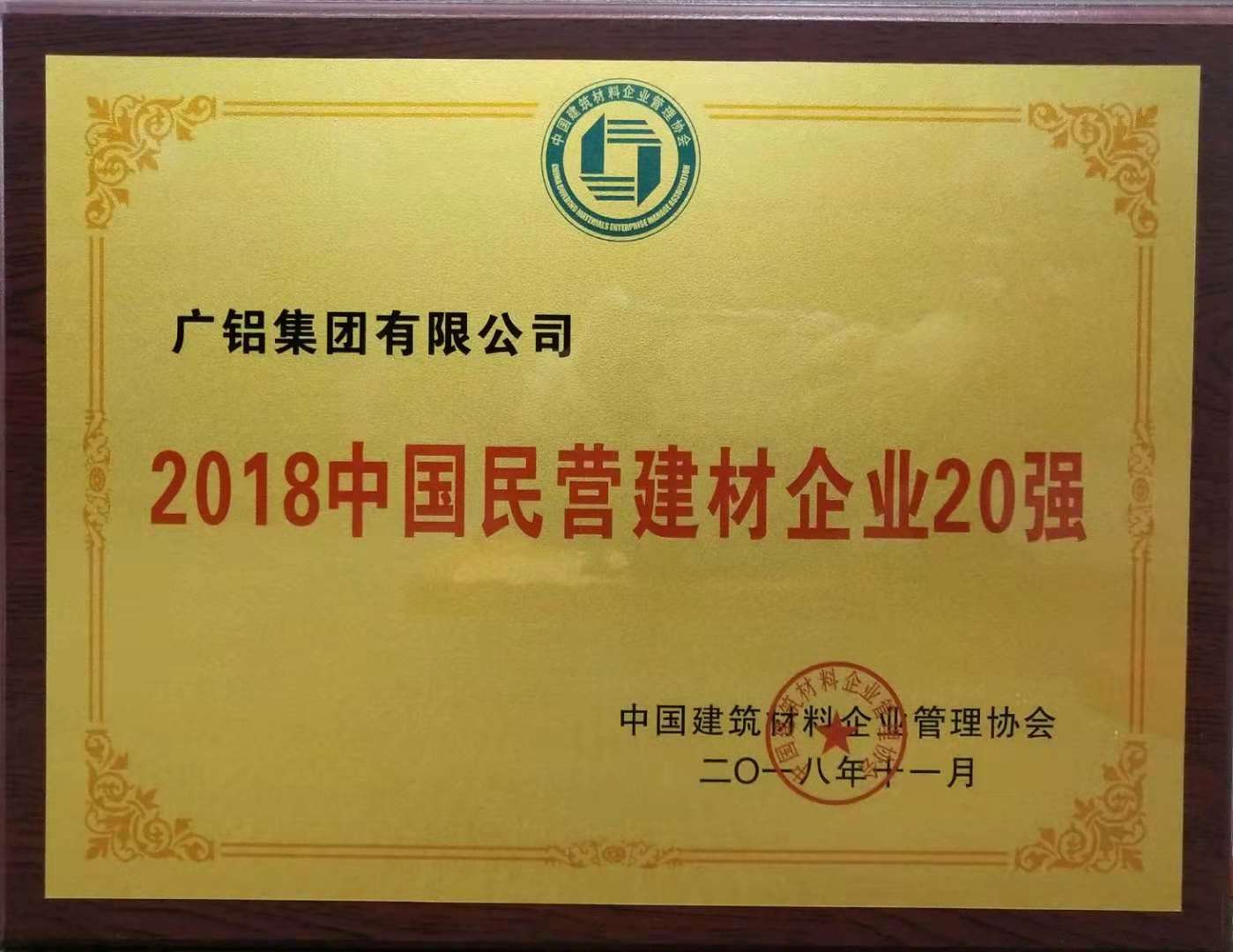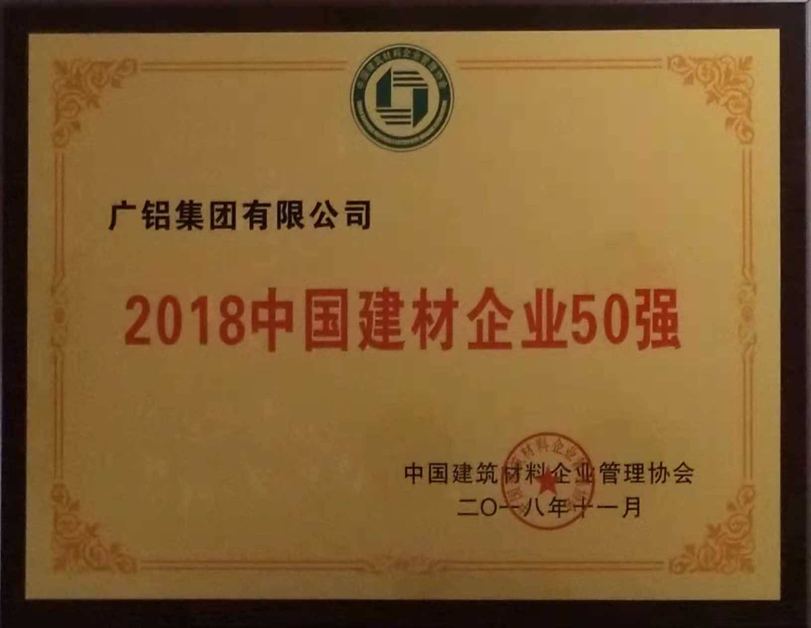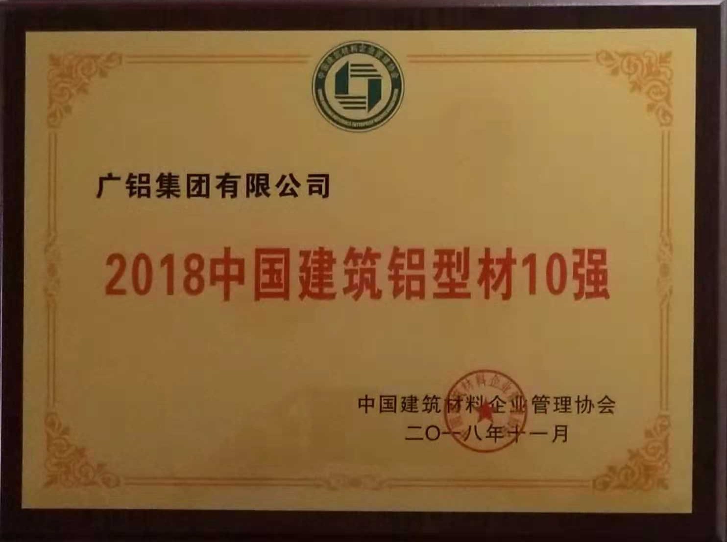 廣鋁榮獲“2018中國建材企業(yè)50強”、“2018中國民營(yíng)建材企業(yè)20強”、“2018中國建筑鋁型材10強”稱(chēng)號