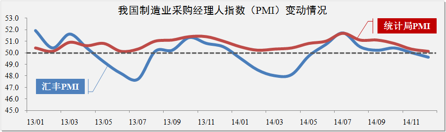 制造業(yè)方面。2014年末我國制造業(yè)采購經(jīng)理指數(PMI)下跌至50.1%,逼近50%的臨界點(diǎn)。匯豐PMI跌至49.6%,較統計局發(fā)布PMI低0.5個(gè)百分點(diǎn),我國中小企業(yè)的發(fā)展速度明顯放緩。12月份PMI數據回落至臨界點(diǎn)具有季節性因素影響,但從全年變動(dòng)趨勢上看,PMI及匯豐PMI的持續下滑說(shuō)明我國制造業(yè)發(fā)展所面臨的壓力正不斷地擴大和增強。
