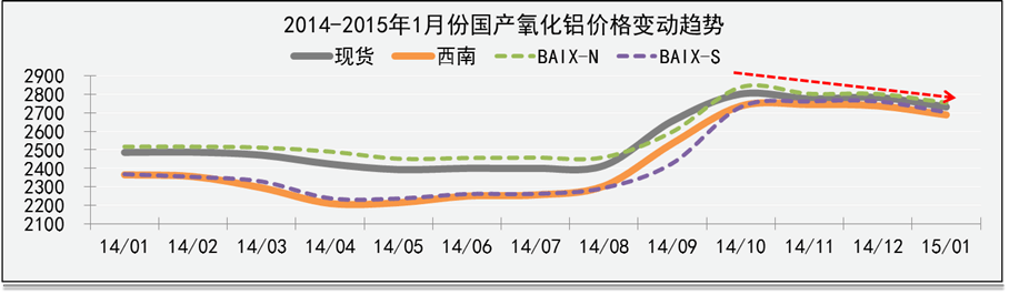 2014年度我國氧化鋁市場(chǎng)價(jià)格總體表現為“先抑后揚”的發(fā)展趨勢,上半年市場(chǎng)整體延續了2013年度的弱勢,北方地區氧化鋁現貨價(jià)格最低滑落至2350元/噸,創(chuàng )造了近四年來(lái)的新低。第三季度氧化鋁現貨價(jià)格前期較為平穩,后期價(jià)格則出現急劇攀升的良好發(fā)展趨勢,促使氧化鋁市場(chǎng)價(jià)格短期內提升至近三年的高點(diǎn)。第四季度氧化鋁現貨價(jià)格又逐步呈現回落趨勢,并于2014年底基本企穩。整體上看,2014年度氧化鋁國產(chǎn)現貨加權價(jià)格為2544元/噸,同比上漲1.4%,西南地區均價(jià)為2420元/噸,同比上漲2.1%。