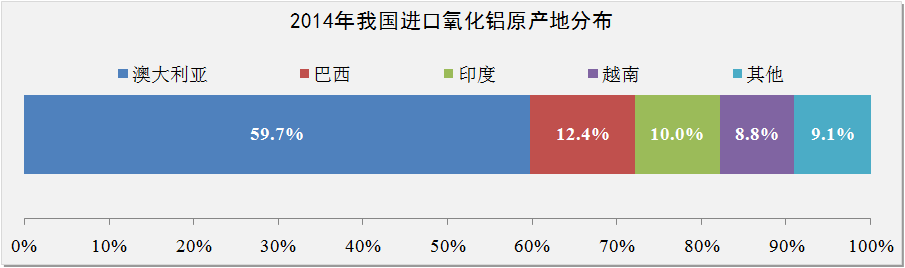 進(jìn)口方面。2014年度我國進(jìn)口氧化鋁共528萬(wàn)噸,進(jìn)口同比增長(cháng)37.7%。從原產(chǎn)地上看,全年最大進(jìn)口國仍為澳大利亞,進(jìn)口氧化鋁占比59.7%;前四位原產(chǎn)地氧化鋁進(jìn)口占比高達90.9%。進(jìn)口價(jià)格方面,全年進(jìn)口氧化鋁均價(jià)為382.34美元/噸,折合人民幣均價(jià)2343元/噸。