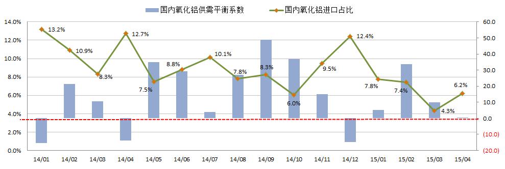 3:我國氧化鋁供需平衡系數及國內氧化鋁進(jìn)口占比變動(dòng)圖