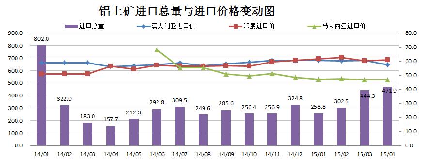 鋁土礦進(jìn)口價(jià)格或持續穩中有降態(tài)勢。近兩個(gè)月我國的鋁土礦進(jìn)口量都維持在較高的水平。監控數據顯示,2015年4月份我國鋁土礦進(jìn)口量猛然上漲至471.9噸,同比增長(cháng)199.2%,環(huán)比增長(cháng)6.2%。其中,澳大利亞、印度和馬來(lái)西亞為主要的進(jìn)口國,其進(jìn)口量占比高達93.6%,進(jìn)口價(jià)格保持穩定并略有下降。預計鋁土礦進(jìn)口價(jià)格將保持穩中有降趨勢,但下降幅度不會(huì )很大。