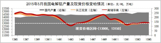 市場(chǎng)運行低位偏冷。市場(chǎng)供給方面,5月份我國電解鋁產(chǎn)量為256萬(wàn)噸,環(huán)比基本持平,同比增長(cháng)12%,市場(chǎng)供給穩定?,F貨價(jià)格方面:5月份電解鋁現貨價(jià)格基本擺脫了年初快速下滑的頹勢,目前國產(chǎn)現貨價(jià)格基本穩定在13000元/噸-13150元/噸的區間范圍。從價(jià)格波動(dòng)趨勢上看,5月份電解鋁現貨市場(chǎng)價(jià)格略高于去年同期水平,但尚未出現季節性反彈跡象。