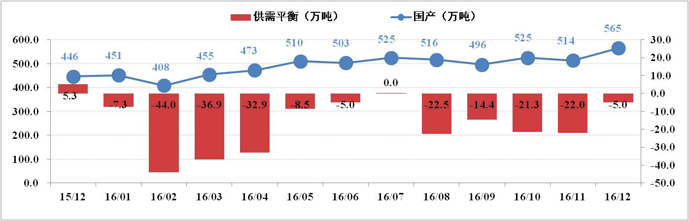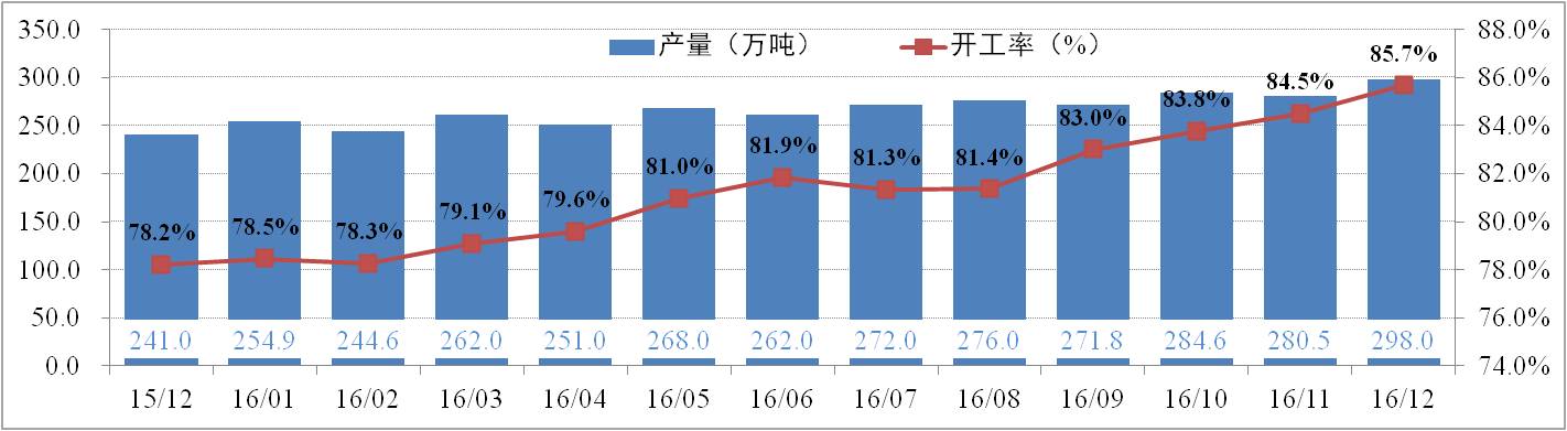供給方面:12月份全國電解鋁有效產(chǎn)能為4,219.5萬(wàn)噸,運行產(chǎn)能3,615.3萬(wàn)噸,開(kāi)工率為85.68%。其中,12月份電解鋁總產(chǎn)量為294.2萬(wàn)噸,日化產(chǎn)量9.49萬(wàn)噸,供應持續增加。調研數據顯示,2016年國內電解鋁已累計減產(chǎn)88.4萬(wàn)噸;累計復產(chǎn)242.55萬(wàn)噸,待復產(chǎn)約60萬(wàn)噸;新產(chǎn)能已投產(chǎn)393.8萬(wàn)噸,待投產(chǎn)71萬(wàn)噸。