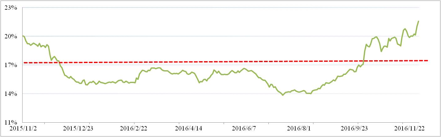 滬鋁三月比例價(jià)方面,11月滬鋁三月合約下行趨勢明顯,月末加權平均價(jià)報收于13,118元/噸。若按17.6%氧化鋁作價(jià)比例,2017年1月份全國氧化鋁長(cháng)單加權價(jià)格為2,309元/噸,與現貨加權價(jià)格的價(jià)差擴大到646元/噸。12月份期鋁全國氧化鋁現貨加權價(jià)與滬鋁三月加權平均價(jià)實(shí)際折算比例為22.95%。