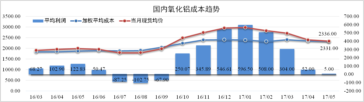 分析認為:6月份,國內煤炭和片堿價(jià)格有所下降,但鋁土礦供應受?chē)鴥拳h(huán)保督查影響將出現緊缺局面。預計氧化鋁成本將穩中有所下降。