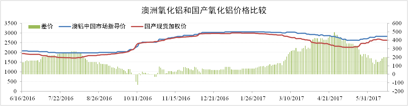 國際方面,6月16日澳鋁中國市場(chǎng)指導價(jià)為2825元/噸,同比上漲7.62%。國產(chǎn)氧化鋁與澳洲進(jìn)口氧化鋁價(jià)差縮小至186元/噸,氧化鋁進(jìn)口窗口逐步打開(kāi)。國內氧化鋁價(jià)格大漲以及進(jìn)口氧化鋁需求提高,澳鋁指導價(jià)跟隨國內價(jià)格表現堅挺。