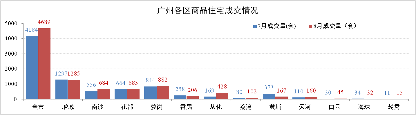 成交量方面:8月廣州市住宅成交有所回暖,但仍維持在歷史低位水平,成交主要在增城、花都、南沙和蘿崗四區。其中,增城區一手商品住宅網(wǎng)簽1,285套,環(huán)比下降0.93%。