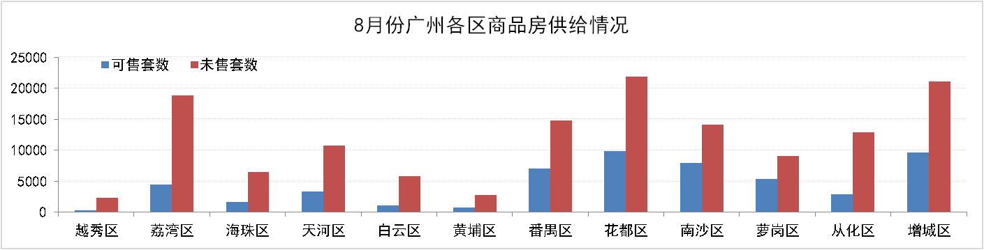 8月31日,廣州市新建住宅商品房共194,949套,環(huán)比上升3.1%,其中:可售住宅商品房為54,104套,占比27.75%;未售住宅商品房140,845套,占比72.25%?;ǘ?、增城、番禺、南沙庫存量較高,可售和未售房源累計占全市比例分別為63.73%和51.13% 。