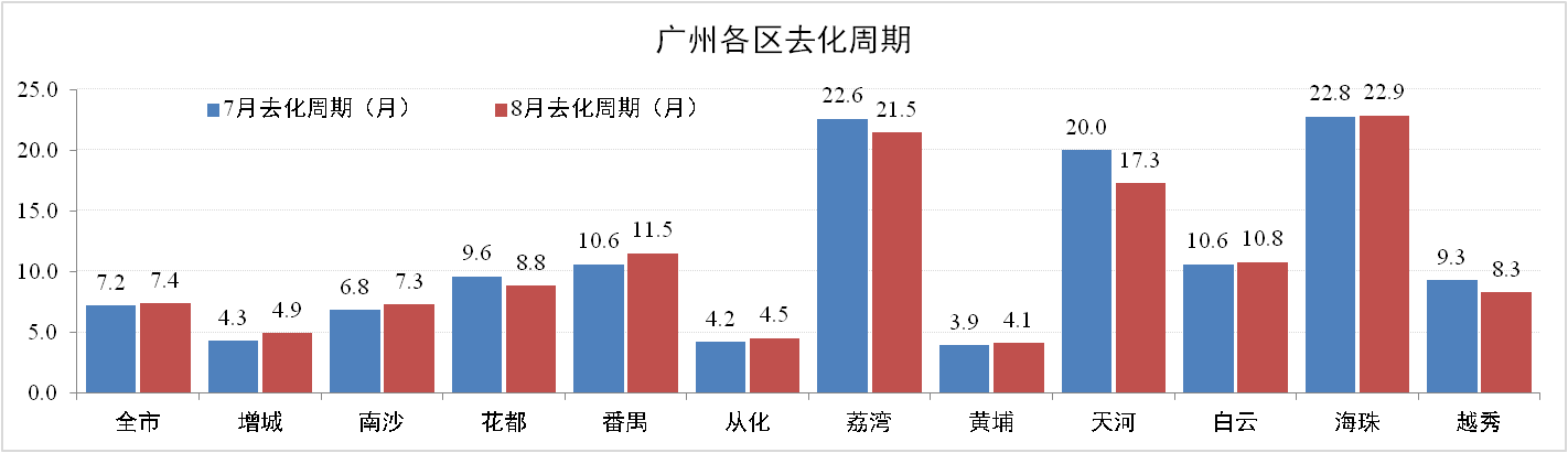 8月份廣州住宅地產(chǎn)去化率達86.6%,去化周期環(huán)比增加0.2個(gè)月為7.4個(gè)月。其中,增城、南海、番禺三區去化周期有所上升。但由于外圍地區剛需強勁,增城、從化、黃埔等保持低去化周期,增城去化周期僅為4.3個(gè)月。