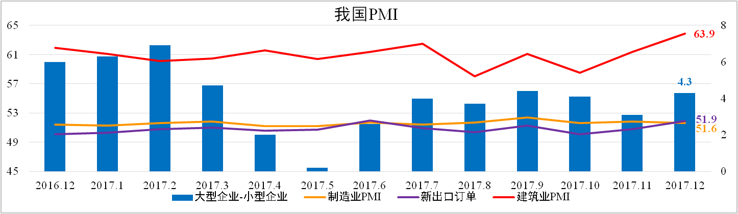 12月我國制造業(yè)PMI為51.6,較上月下滑0.2個(gè)百分點(diǎn)。其中,出口訂單繼續上升至51.9,顯示外需保持強勢;大企業(yè)與小企業(yè)之差有所擴大,表明在環(huán)保壓力下大型企業(yè)達標能力強;另外,建筑業(yè)意外錄得63.9的高位。