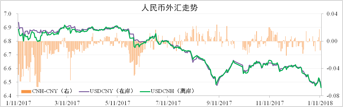 人民幣近期大幅上漲,截止2018年1月12日,在岸人民幣匯率為6.4606,環(huán)比升值2.43%,離岸人民幣匯率為6.4605,環(huán)比升值2.51%。1月9日央行通知部分中間價(jià)報價(jià)行對逆周期因子進(jìn)行調整,調整后相當于無(wú)逆周期調節。
