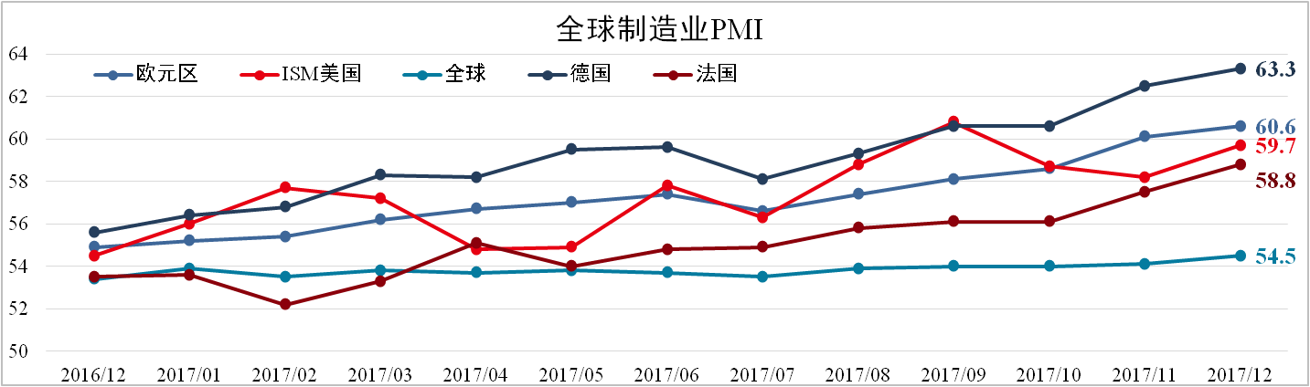 分析認為:主要經(jīng)濟體拉動(dòng)世界經(jīng)濟持續處于擴張區間。隨著(zhù)各國逐步進(jìn)入貨幣緊縮周期以及勞動(dòng)力市場(chǎng)接近充分就業(yè),經(jīng)濟增長(cháng)動(dòng)力將有所放緩。預計2018年全球經(jīng)濟穩中向上,但PMI中樞將有所下降。