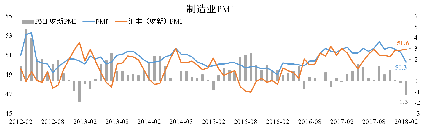 由于春節前后生產(chǎn)活動(dòng)放緩、制造業(yè)員工返鄉過(guò)節以及供需減弱等因素,2月官方制造業(yè)PMI較上月大幅下滑1個(gè)百分點(diǎn)至50.3,超出此前預期。而財新PMI為51.6,較上月擴大0.1個(gè)百分點(diǎn)。
