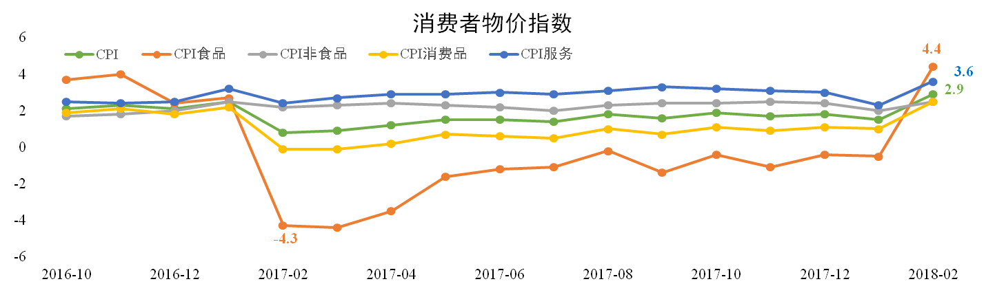 受春節錯位影響,食品價(jià)格同比大幅上升,拉動(dòng)CPI上揚。據統計局數據,2月份我國CPI同比為2.9%,較上月擴大1.4個(gè)百分點(diǎn),為2013年11月以來(lái)的最高值。主要分項均有不同程度上漲,其中食品同比上漲4.4%。