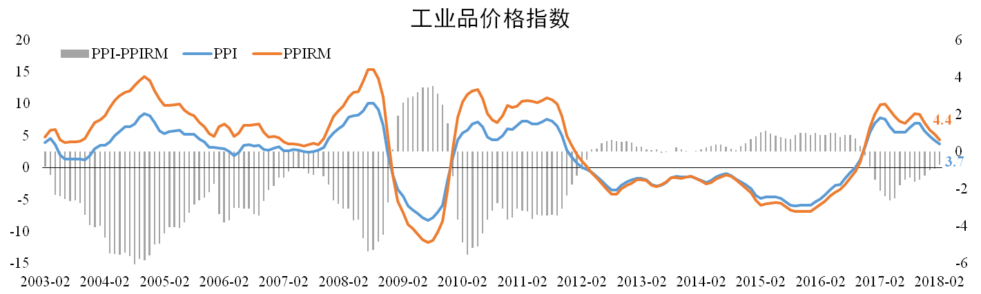 分析認為:PPI與PPIRM增速差距收縮反應工業(yè)企業(yè)盈利能力逐步改善。而受供給側改革力度邊際走弱以及終端需求放緩影響,疊加高基數效應,3月份PPI增速將繼續下滑。