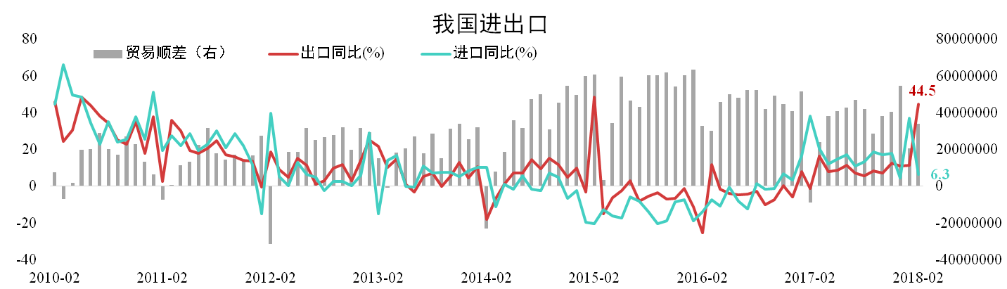 進(jìn)出口增速出現分化,內需有轉弱跡象。2月份出口同比增長(cháng)44.5%,較上月大幅回暖;進(jìn)口同比下滑30.3個(gè)百分點(diǎn)至6.3%。貿易順差337億美元,其中對美貿易順差210億美元,對美順差擴大態(tài)勢并未轉變。