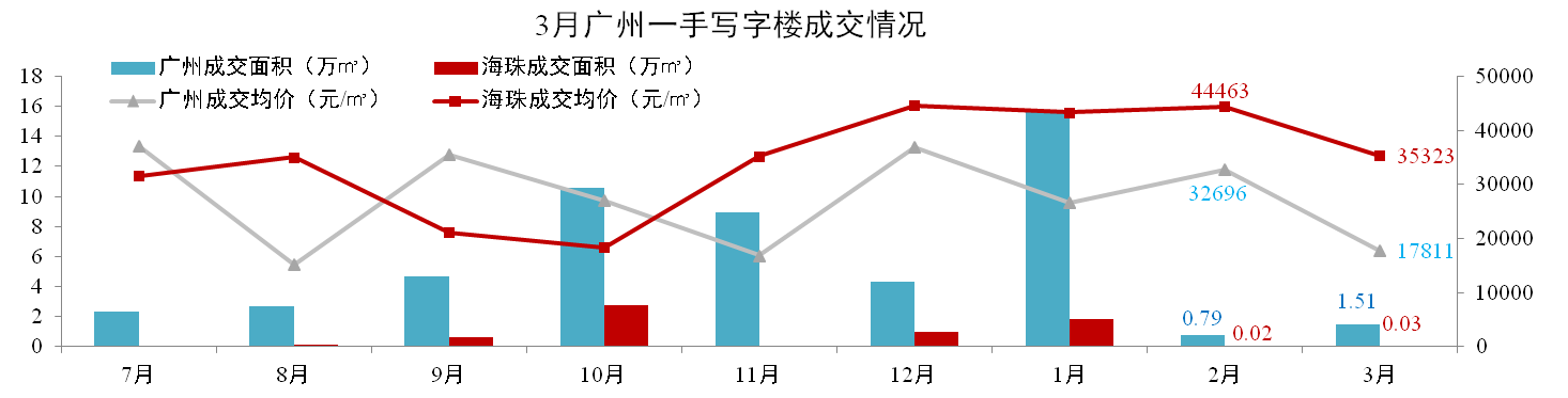 3月,廣州一手寫(xiě)字樓成交1.51萬(wàn)m²,環(huán)比上升23%,成交均價(jià)17,811元/m²,環(huán)比下跌36%。其中海珠區成交0.03萬(wàn)㎡,環(huán)比上升50%,成交均價(jià)35,323元/㎡,環(huán)比下降21%。