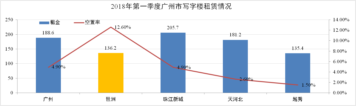 根據戴德梁行《2018年廣州市第一季度寫(xiě)字樓速遞》報告,2018第一季度廣州市甲級寫(xiě)字樓租金為188.6元/㎡/月,環(huán)比上升3.9%;琶洲市場(chǎng)平均租金136.2元/㎡/月,環(huán)比上升4.9%。全市空置率為4.9%,琶洲空置率為12.6%。