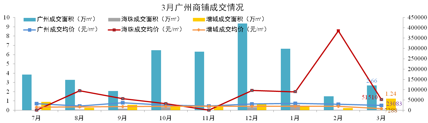 3月廣州一手商鋪成交2.66萬(wàn)㎡,環(huán)比增加88%。海珠區成交0.01萬(wàn)㎡,增城市場(chǎng)成交1.24萬(wàn)平米,環(huán)比上升474%。全市成交均價(jià)23,083元/㎡,環(huán)比下降18%,海珠區均價(jià)51,510元/㎡,增城區均價(jià)7,288元/㎡。