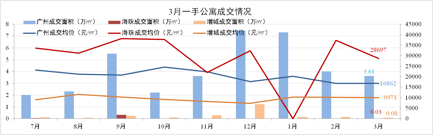 3月廣州一手公寓成交600套,成交面積3.61萬(wàn)㎡,環(huán)比下跌0.3%。全市成交均價(jià)16,862元/㎡,環(huán)比上升2%。海珠、增城兩區成交量式微,價(jià)格保持穩定。
