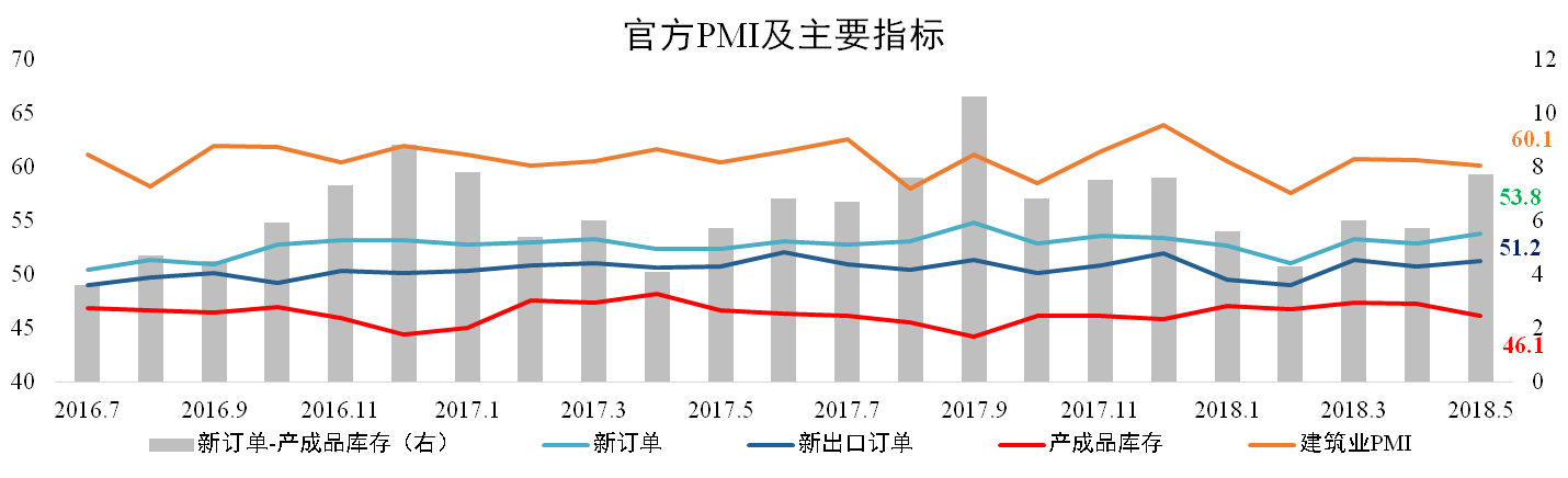 5月份產(chǎn)成品庫存為46.1點(diǎn),較4月下降0.9個(gè)百分點(diǎn);新訂單為53.8點(diǎn),較上月上升0.5個(gè)百分點(diǎn),其中新出口訂單為51.2,較上月上升0.5個(gè)百分點(diǎn)。建筑業(yè)PMI延續下滑走勢,較4月下滑0.5個(gè)百分點(diǎn)至60.1點(diǎn)。