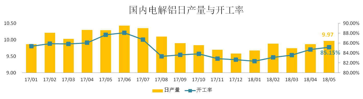 5月份中國電解鋁總產(chǎn)能4369.8萬(wàn)噸,運行產(chǎn)能3735.2萬(wàn)噸,開(kāi)工率85.15%,日產(chǎn)量9.97萬(wàn)噸,環(huán)比上升1.26%。截至6月17日,2018年國內新產(chǎn)能已投產(chǎn)51.7萬(wàn)噸,待開(kāi)工290萬(wàn)噸,年內在建且可投產(chǎn)新產(chǎn)能369.5萬(wàn)噸。