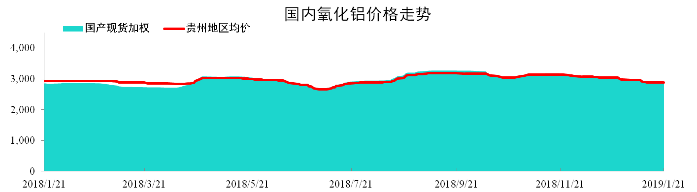 截至1月21日,國產(chǎn)氧化鋁現貨加權均價(jià)為2871元/噸,同比上漲0.56%,環(huán)比下降4.92%。貴州地區氧化鋁現貨加權均價(jià)為2882元/噸,同比下降2.36%,環(huán)比下降5.51%。