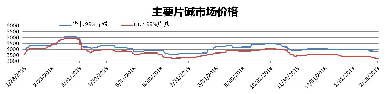 2月份國內片堿的總體成交有所下降,市場(chǎng)整體走勢繼續下行。截止到2月28日,西北99%片堿市場(chǎng)價(jià)為3225元/噸,環(huán)比下降3.42%;華北99%片堿市場(chǎng)價(jià)為3775元/噸,環(huán)比下降1.79%。
